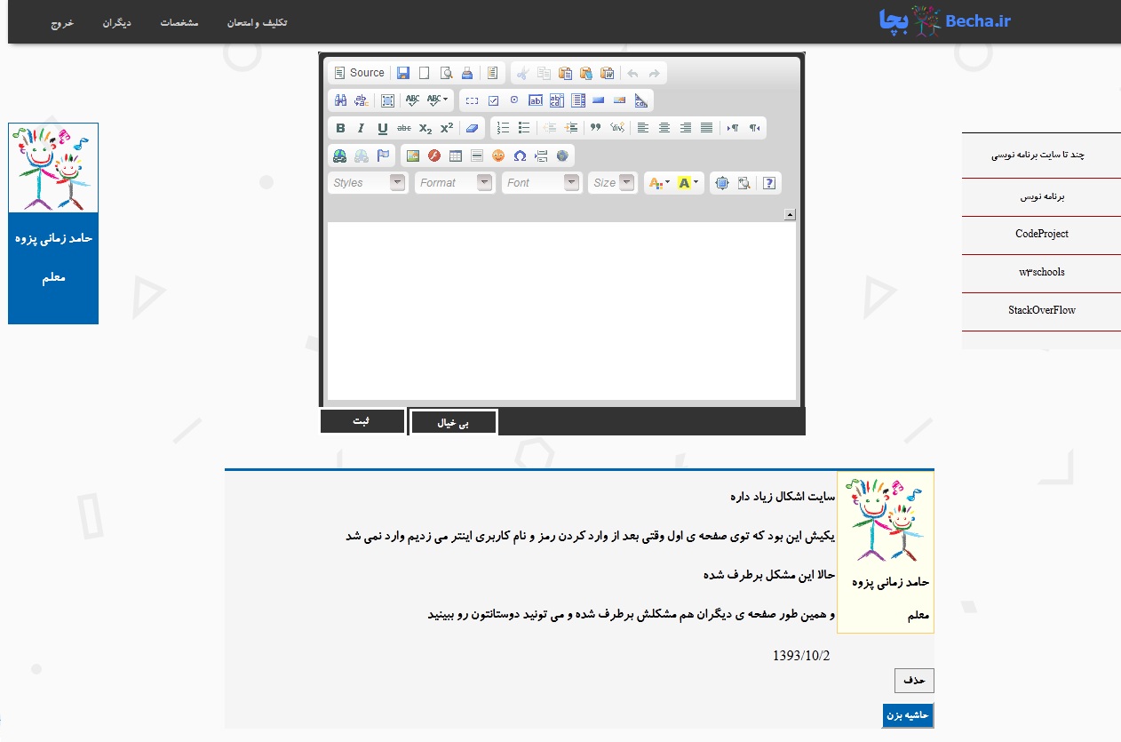 یک سایت ساده و کوچک برای ارتباط با دانش آموزان کلاس های کامپیوترم. امکان گذاشتن مطلب توسط بچه ها و انجام پرسش کلاسی و همین طور دیدن نمرات و تکالیفشان و همین طور امکان حاشیه گذاری بر مطالب و دیدن دیگران دراین سایت کوچک و ساده گنجانده شده اند