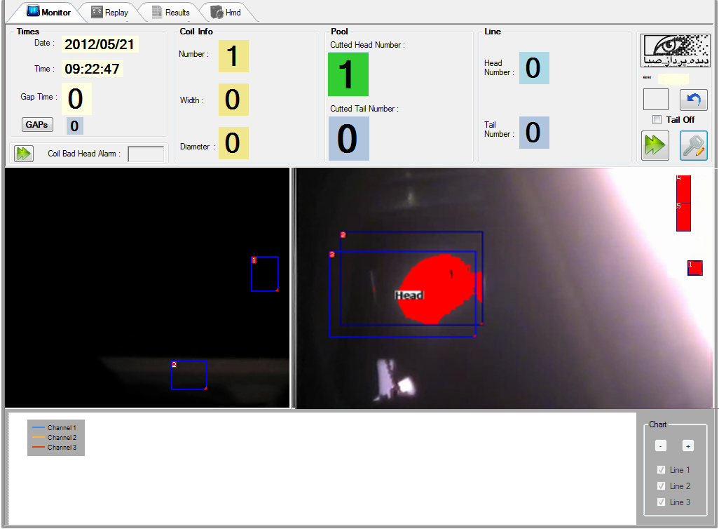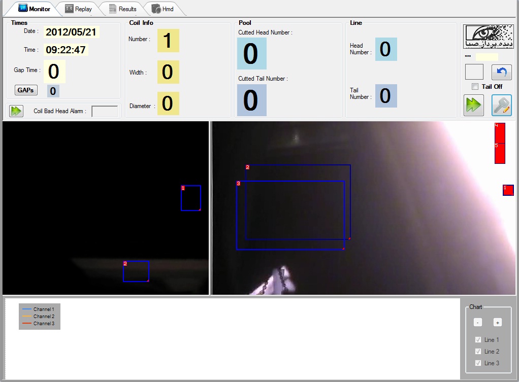 این نرم افزار جهت مشاهده ، پردازش و ذخیره ی آنلاین تصویر ورق های فولاد در قسمت نورد گرم مجتمع فولاد مبارکه ی اصفهان طراحی شده است. تصاویری که در اختیار این نرم افزار قرار میگیرد و کار پردازش تصویر روی آن انجام می شود از سه دوربین تامین می شود .تصویر دوربین اول برای مشاهده ی ورود ورق روی خط و چک کردن مناسب بودن ارتفاع سر ورق استفاده میشود. تصویر دوربین دوم برای مشاهده ی سر ورق و ته ورق قطع شده ، چک کردن افتادن آنها در حوضچه و همین طور تشخیص جهت حرکت ورق استفاده میشود.تصویر دوربین سوم برای چک کردن بودن ورق روی خط و وارد و خارج شدن ورق استفاده میشود. دیگر ورودی های نرم افزار سیگنال های مربوط به سرعت خط هستند که در نمودار پایین صفحه نمایش داده می شوند. ورودی دیگر نرم افزار اطلاعات مربوط به هر ورق هستند که از سیستم جامع فولاد روی اترنت دریافت میشود و در قسمت بالا نمایش داده میشوند. تصاویر دریافتی از دوربین ها در 6 قسمت مورد پردازش رنگ قرار می گیرد ، محل پردازشگر های تصویر را می توان به سادگی با قرار دادن موس در قسمت سمت چپ بالای هر پردازشگر جابه جا نمود . و اندازه ی این پردازشگر ها هم با قرار دادن موس در قسمت پایین سمت راست هر پردازشگر می توان تغییر داد.