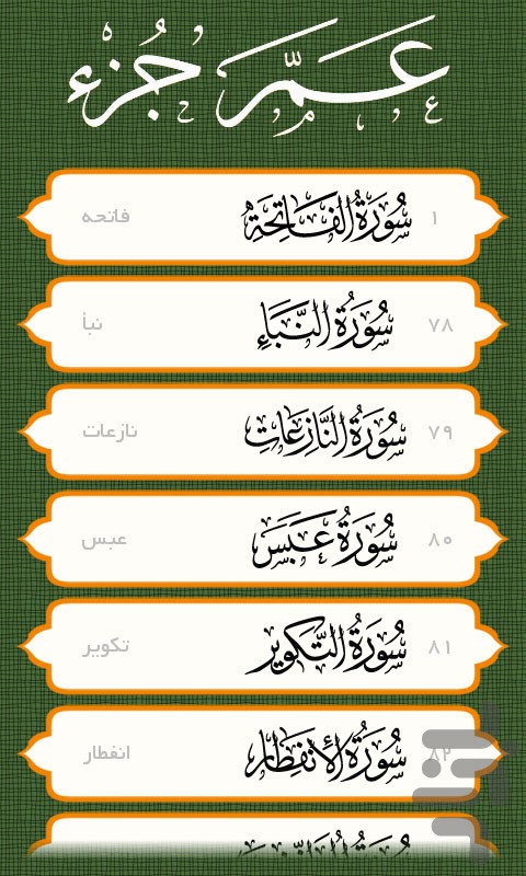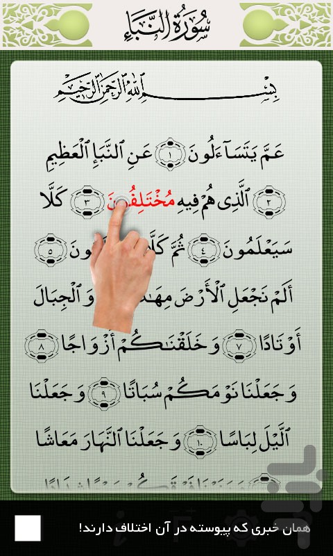 در این برنامه كه به نوعی خودآموز روخوانی و روانخوانی جز سی قرآن كریم هم هست با لمس كردن هر كلمه در متن، قرآن با قرائت صحیح پخش میگردد. از این ویژگی میتوانید برای تصحیح قرائت خود استفاده نمایید و خودتان قرآن را تلاوت كنید و هركجا با مشكل مواجه شدید بر روی آن كلمه ضربه بزنید و دیگر نیازی نیست از ابتدا تا انتهای آیه را برای رسیدن به كلمه مورد نظر صبر كنید.
