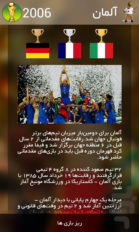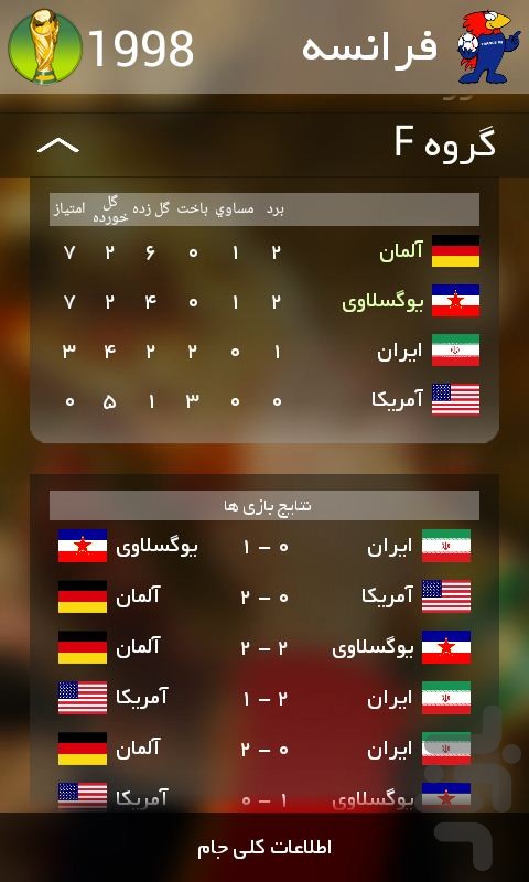 تاریخچه كامل 19 دوره جام جهانی فوتبال را در یك نرم افزار به همراه خود داشته باشید. لیست كامل گروه بندی ها، تیم های صعود كننده، آقای گل هر دوره، بیشترین گل های رد و بدل شده، آمار دقیق گل های رد و بدل شده و تركیب بازیكنان تیم های شركت كننده و ... این برنامه به صورت كاملا تعاملی ایجاد شده است و تقریبا هر جایی از برنامه كه بر روی نام و یا پرچم تیم و یا نتیجه بازی ها كلیك كنید جزییات مربوطه برای شما نمایش داده خواهد شد.