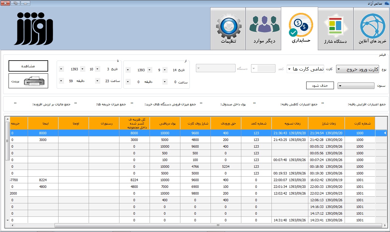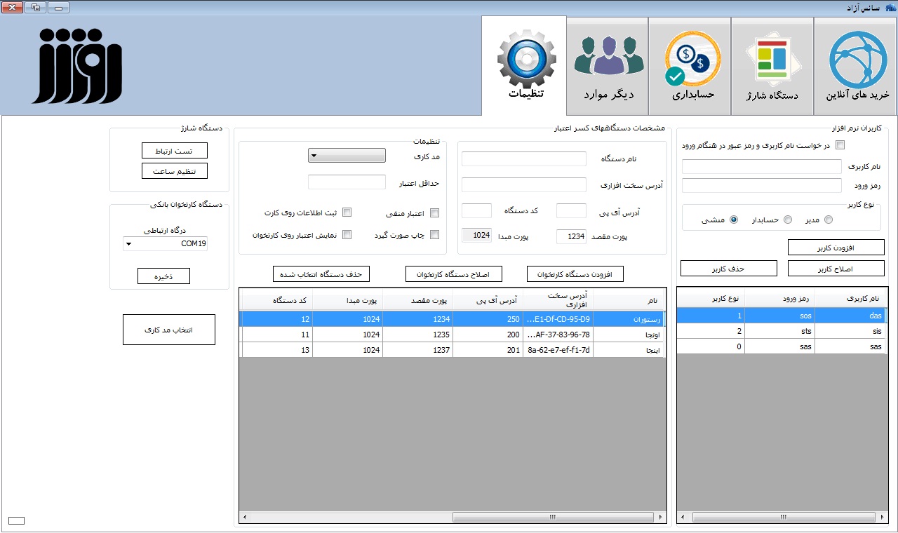 این نرم افزار برای مدیریت دستگاه های کارتخوان شرکت روژان الکترونیک سپاهان آماده شده است. دستگاه ها به دو شکل اترنت و همین طور یو اس بی به کامپیوتر سرور متصل می شوند و اطلاعات دریافتی از آن ها شامل شارژ کارت، خرید، کسر اعتبار، جریمه و تسویه حساب در پایگاه داده ی نرم افزار ذخیره شده و به صورت حسابداری ارائه می شود. در این نرم افزار امکان ارسال کالاها و دیگر تنظیمات به دستگاه های شبکه و یو اس بی وجود دارد.